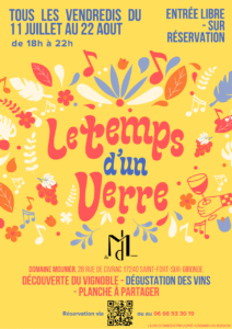 - « LE TEMPS D’UN VERRE » – Soirées EstivalesDurant la période estivale, nous ouvrons les portes de notre domaine familial tous les vendredis soirs avec notre bar à vins accompagné de planches « terroir » à partager, le tout dans une ambiance guiguette !! Ces soirées… Lire la suite : « LE TEMPS D’UN VERRE » – Soirées Estivales